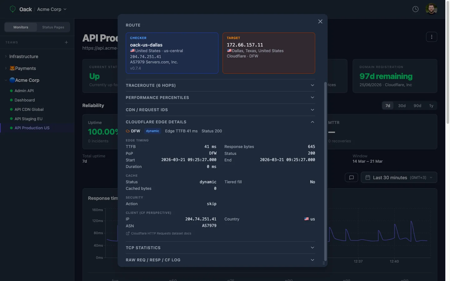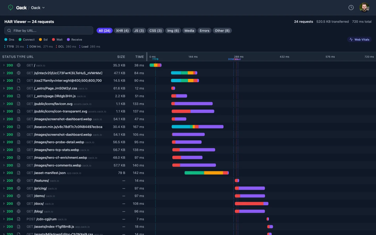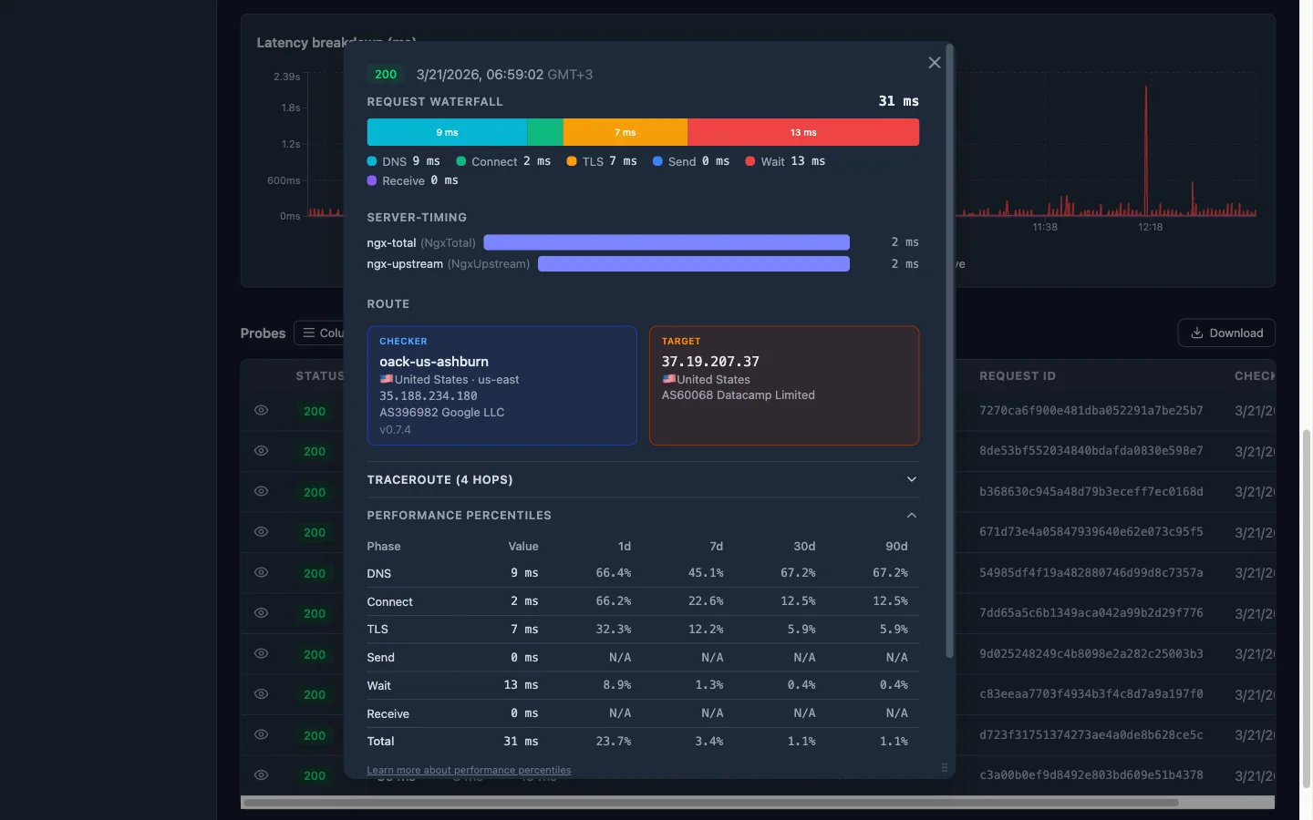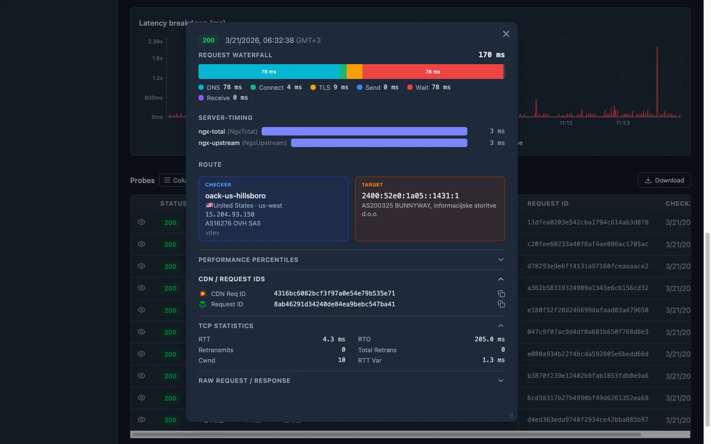 TCPレベル統計、Server-Timing解析、CDNエンリッチメント、HARウォーターフォール、レイテンシパーセンタイル。ネットワーク層まで問題を診断。