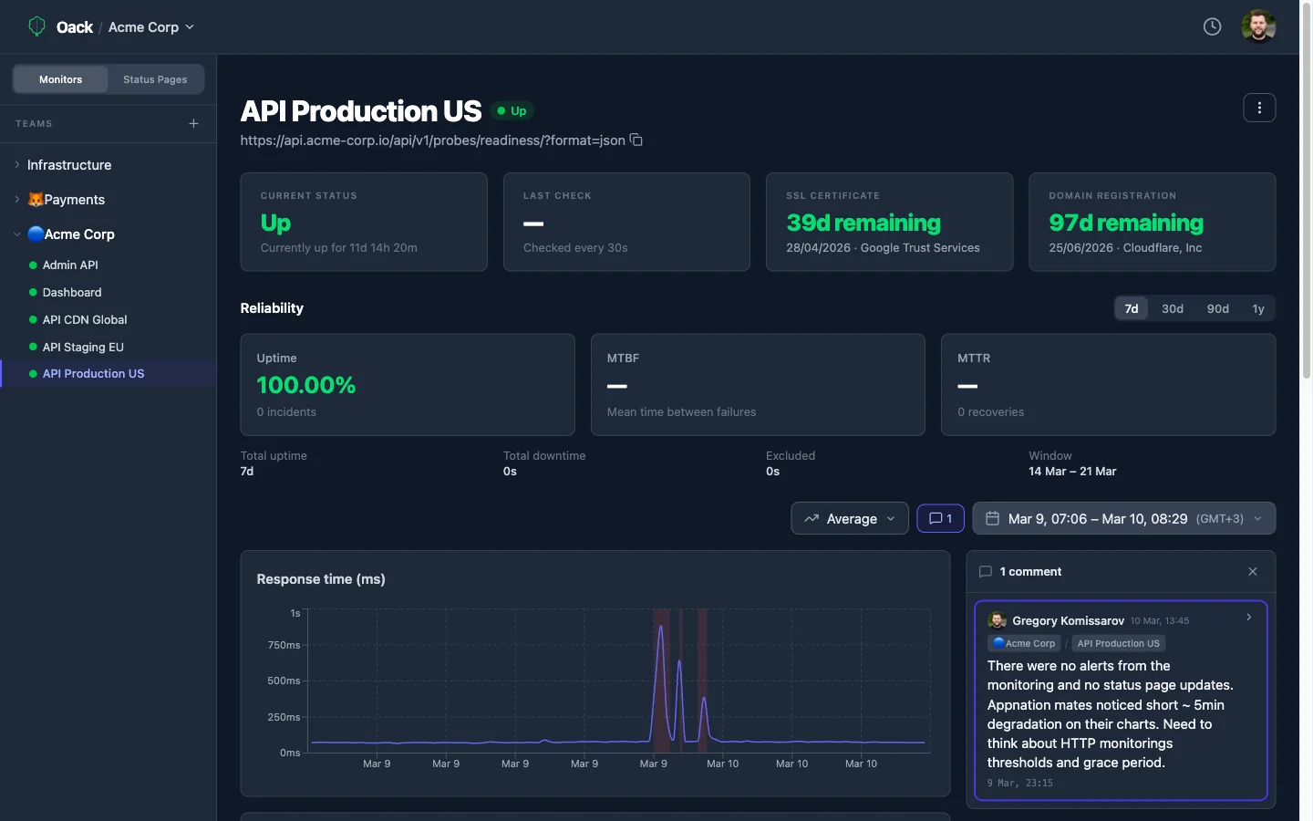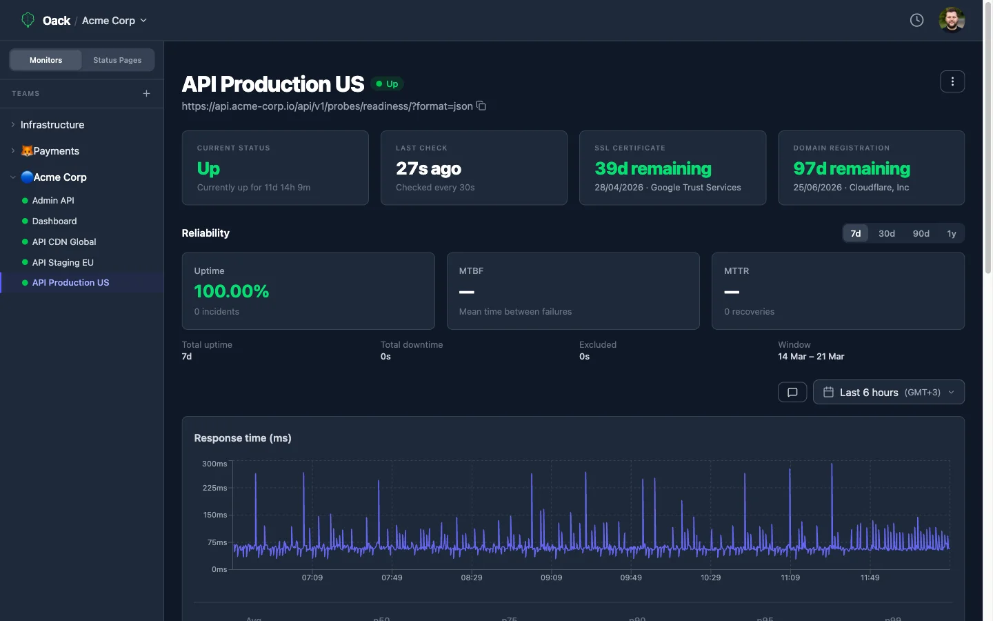 稼働率チャートからプローブウォーターフォール、インシデントタイムライン、ステータスページの健全性まで — すべてを一箇所で。