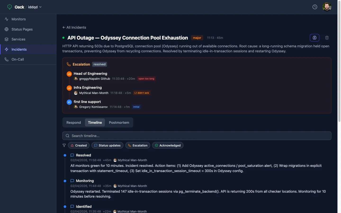 宣言、エスカレーション、解決。ローテーション付きオンコールスケジュール、多段エスカレーションポリシー、AI根本原因分析付きポストモーテム。